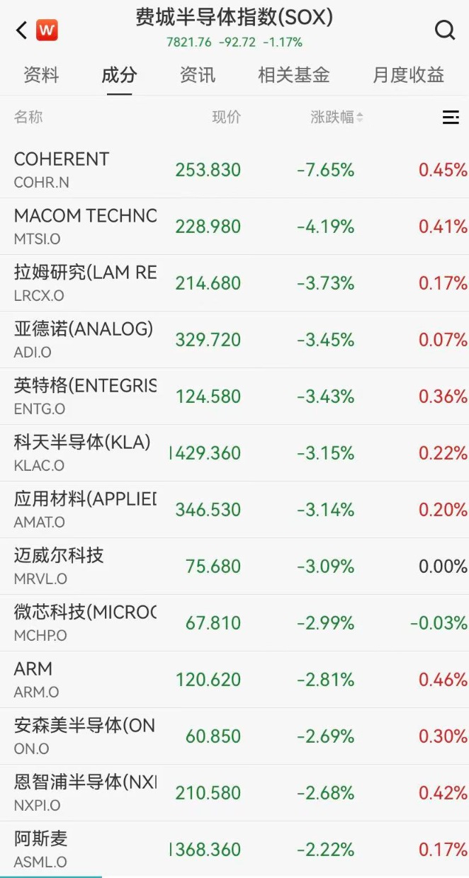 芯片股盘中跳水,半导体产业链多数飘绿,费城半导体指数跌1.17%。闪迪跌超5%,拉姆研究、科天半导体、应用材料跌超3%,希捷科技、阿斯麦跌超2%;博通逆势涨超4%,其发布强劲业绩展望,预计人工智能芯片收入明年将超过1000亿美元。