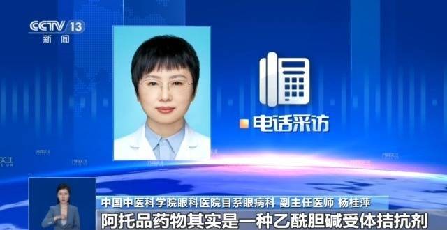 中国中医科学院眼科医院目系眼病科副主任医师 杨桂萍:阿托品是一种乙酰胆碱受体拮抗剂,它是通过麻痹睫状肌和瞳孔括约肌,同时也能够刺激多巴胺,放松眼部的肌肉,延缓眼轴的拉长速度,来达到缓解近视度数的加深,它核心的作用就是延缓眼轴的增长。目前通过循证医学验证,它是全球认可的预防近视药物。